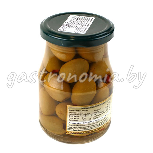 Состав: Оливки зелёные, красный натуральный перец, вода, соль, регулятор кислотности: Е330, Е270.