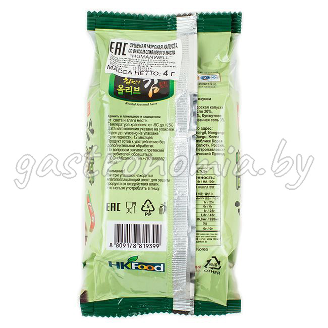 Состав: Сушеная морская капуста 61%, кукурузное масло 20%, оливковое масло 9%, кунжутное масло 8%, рафинированная соль 3%.
