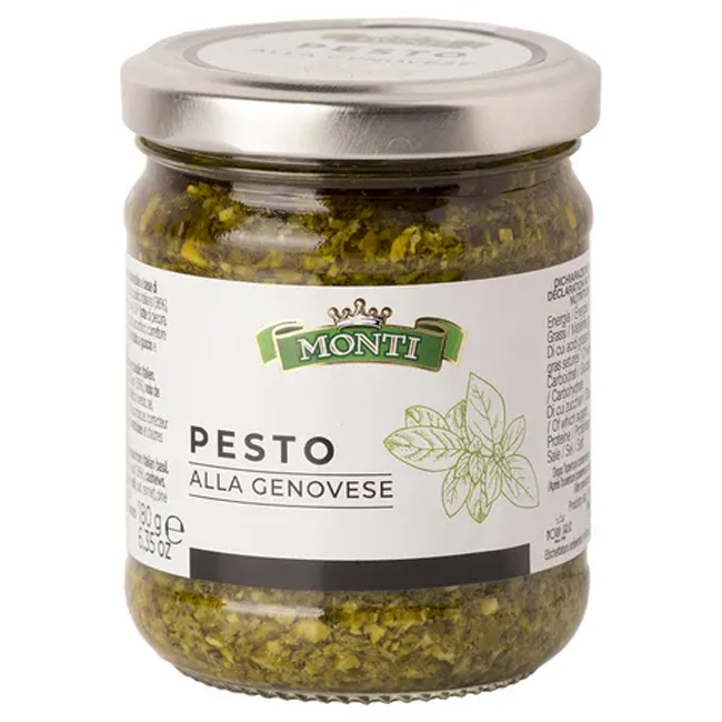 Состав: подсолнечное масло, итальянский базилик 36%, орехи кешью, соль, сыр Пекорино Романо (овечье молоко, соль, сычужный фермент животного происхождения), кедровые орехи, чеснок, регуляторы кислотности: аскорбиновая кислота, лимонная кислота. Может содержать следы арахиса и других орехов. Не содержит глютен.