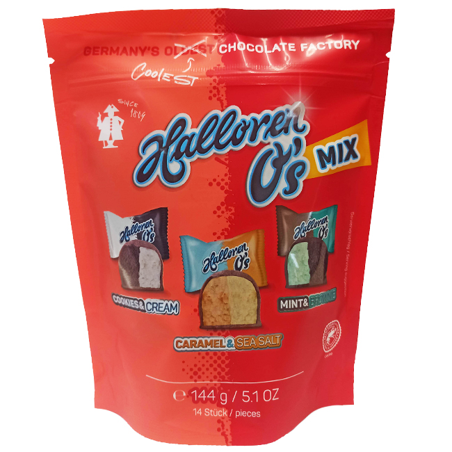 В наборе шоколадных конфет Mix т.м."Halloren O's" :шоколадные конфеты "Halloren O's" с начинкой со вкусом печенье и крем, шоколадные конфеты "Halloren O's" с начинкой со вкусом карамели и морскойсолью, шоколадные конфеты "Halloren O's" с начинкой со вкусом мяты и брауни