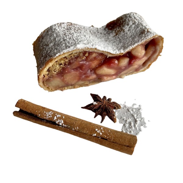 Состав: яблоко свежее, наполнитель "Термошка вишня" (сахар, патока крахмальная, вода питьевая, сок вишневый востановленный, пюре яблочное, загустители: цитрусовая клетчатка и пектин Е440, регуляторы кислотности: кислота лимонная Е330, цитрат натрия 3-замещенный Е331iii, цитрат кальция Е333, красители: кармин Е120 и антоциан Е363, консервант сорбат калия Е202, ароматизатор пищевой), вишня свежемороженая, сахар, грецкий орех очищеный, сухари панировочные пшеничные (мука пшеничная высшего сорта, соль поваренная пищевая йодированная (содержит йдат калия), вода питьевая), тесто слоеное дрожевое (мука пшеничная хлебопекарная высшего сорта, маргарин (масло растительное, вода питьевая, эмульгаторы: моно- и диглицериды жирных кислот, соевый лецитин, соль, сахар, консервант: сорбат калия, краситель: каротин, антиокислитель: аскорбиновая кислота), вода питьевая, сахар, дрожжи хлебопекарные пресованные, соль (содержит агент антислеживающий Е536), комплексная пищевая добавка (пшеничная клейковина, антиокислитель: аскорбиновая кислота, ферментные препараты: альфа- амилаза, гемицеллюлоза), яйцо куриное, молоко ультрапастеризованное 3,1% (молоко нормализованное), вода питьевая, корица молотая.