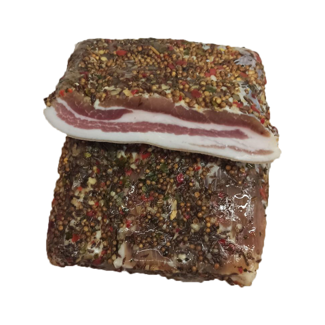 Состав: Продукт из шпика соленый. Состав: грудинка свиная бескостная, соль пищевая поваренная йодированная, смесь для засолки сала Пестрая (чеснок, паприка красная, перец черный, паприка зелёная, лавровый лист), добавка комплексная Универсальная (соль пищевая выварочная экстра, йодат калия, нитрит натрия Е250), тмин, кориандр молотый.