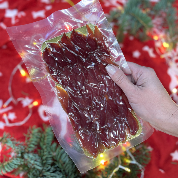 Состав: вырезка свиная, смесь посолочно-нитритная "Универсальная с йодом" (соль пищевая выварочная, консервант и фиксатор окраски-нитрит натрия, агент антислеживающий Е536, йодат калия), комплексная пищевая добавка "Ферментированная ветчина Сицилия" (лактоза, декстроза, вкусоароматический препарат, усилитель вкуса и аромата Е621, дрожжевой экстракт, антиокислитель Е301, Е300, экстракты специ (перец, имбирь, корианд, чили).