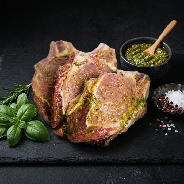 Состав: Полуфабрикат мясной мясокостный Состав:корейка свиная на кости, вода питьевая,соус Песто(подсолнечное масло,кешью, базилик,глюкозный сироп,хлопья картофеля, соль пищевая, оливковое масло,сыр Пармиджано Реджано (молоко,соль пищевая,сычужный фермент,кедровый орех,сафлоровое масло,ароматизаторы,чеснок,молочные протеины,консервант сорбат калия),масло подсолнечное,соль поваренная пищевая йодированная(содержит йдат калия),уксус яблочный,розмарин,сахар,перец черный молотый.