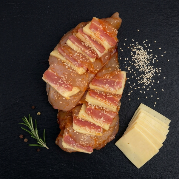 Состав: Кулинарный полуфабрикат. Состав:филе цыпленка-бройлера, бекон копчено-вареный, сыр Моцарелла (изготовлен из молока коровьего нормализованного с использованием сухой лиофизированной заквасочной культуры, уплотнитель хлорид кальция, ферментный препарат животного происхождения-химозин, пепсин), масло подсолнечное рафинированное, соль пищевая поваренная йодированная, кунжут семена, паприка копченая, перец белый молотый