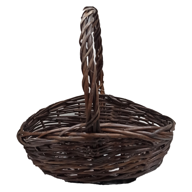 Корзина плетеная из ивовой лозы коричневого цвета. Может быть использована: для упаковки подарков, цветочных композиций; для хранения и транспортировки различных предметов и продуктов; как декоративный элемент интерьера.