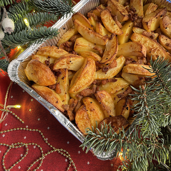 Блюдо рассчитано как гарнир на 6-8 человек. Классический гарнир к новогоднему столу? Конечно картофель! В нашем исполнении он представлен с обжареной грудинкой и идеальным балансом специй. Остается только запечь! Рекомендуемый способ приготовления: извлечь из упаковки, готовить в духовке 20-25 минут при 180*С до румяной корочки. Подавать горячим!