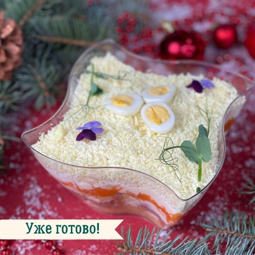 Состав: Тунец, морковь, картофель, яйцо куриное, сыр твердый, лук шалот жареный, яйцо перепелиное, майонез домашний.