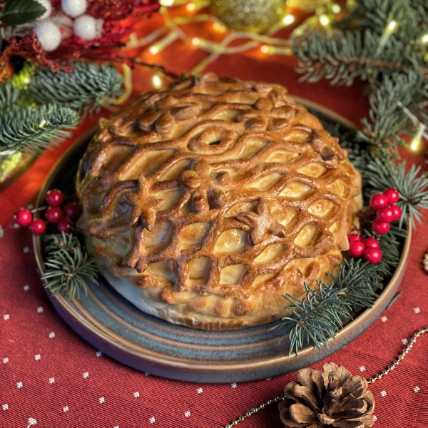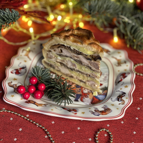 Классический пирог "Курник" в форме полусферы с 3 видами начинки. 1. Начинка с картофелем сыром и яйцом 2. Начинка с бедро цыпленка гриль и соуса "Бешамель. 3. Начинка из обжаренных грибов с луком. Рекомендуемый способ приготовления: прямо в форме и пакете разогреть в духовом шкафу при 160*С - 10-15 минут. Подавать теплым!