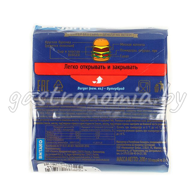 Сыр плавленый Сливочный BURGER (слайсы) 200 г ВИТАКО