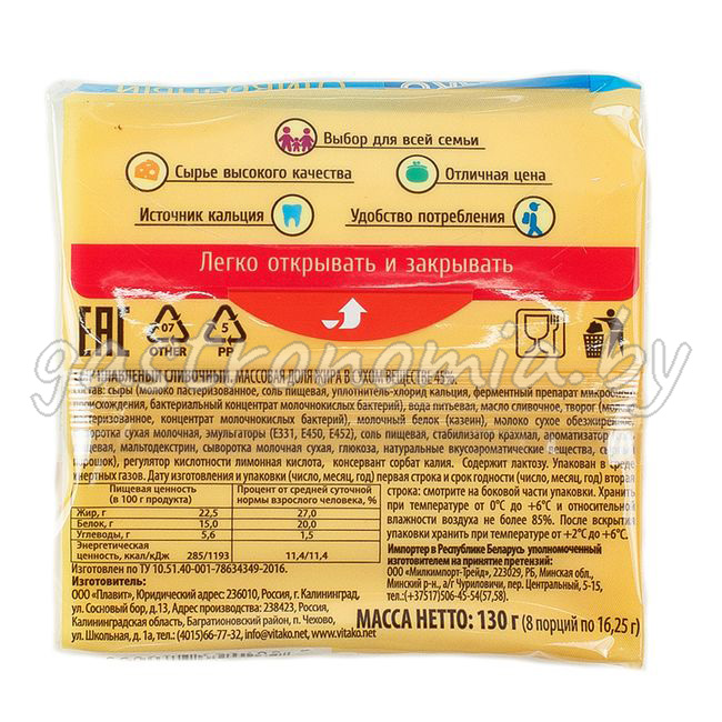 Состав: Сыры полутвердые (молоко пастеризованное, соль поваренная, уплотнитель- хлорид кальция, ферментный препарат микробного происхождения, бактериальный концентрат молочнокислых бактерий), масло сливочное, жир молочный, вода питьевая, молочный белок (казеин), творог (молоко пастеризованное, концентрат молочнокислых бактерий), молоко сухое обезжиренное, сыворотка сухая молочная, соли-плавители (Е339, Е452), соль поваренная пищевая, вкусоароматическая добавка "Сливочная" (соль, мальтодекстрин, сыворотка молочная сухая, глюкоза, натуральные вкусоароматические веществе, сырный порошок, регулятор кислотности лимонная кислота), консервант сорбат калия.