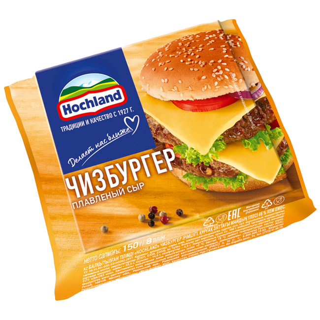 Приготовить вкусный чизбургер проще простого, если под рукой есть ломтики плавленого сыра Hochland чизбургер! Ведь они изготовлены из классического натурального сыра с добавлением сыра Чеддер, поэтому идеально подходят для приготовления бургеров. А квадратная форма и оптимальный размер соответствуют требованиям блюда.
