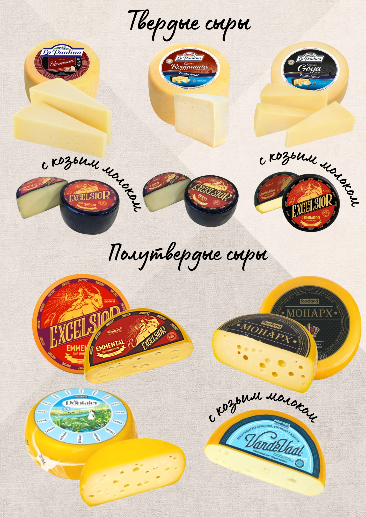 Бренд Excelsior – выдержанные твердые и полутвердые сыры из коровьего и козьего молока. Благодаря латексному покрытию в процессе созревания сыры приобретают красивую корочку, плотную консистенцию и подлинный сырный вкус.