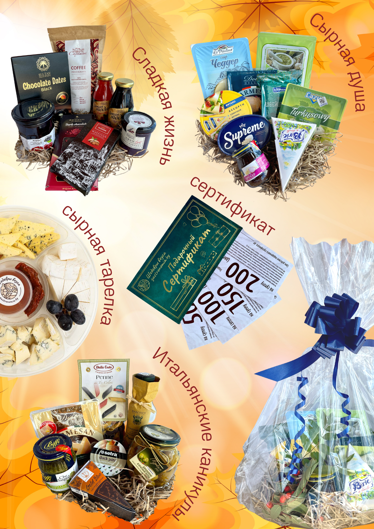 Рассмотрите также сырные и мясные тарелки, соберем и нарежем по вашему вкусу. И универсальный подарок - сертификат «Шедевры вкуса»