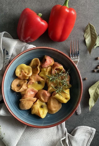 Оригинальные пельмени в виде розочек порадуют и удивят вас и ваших близких сначала внешним видом, а затем и внутренним содержанием. Внутри пельмешек скрывается много сочной и ароматной начинки из индейки, утиной печени и тыквы. Необычное сочетание продуктов позволит воистину насладиться уникальным вкусом. Употреблять наши пельмени мы рекомендуем исключительно целиком, не разрезая ножом, чтобы ни капли не пролить сочного бульона!